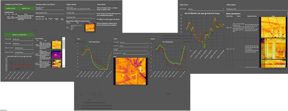 For example, at an Electrical Utility Substation, we collected thermal data on system critical assets using multiple Pan Tilt FLIR sensors. The data collected was associated to predefined standards for real time analysis. This information was also stored for historical trends creating a treasure chest for reporting. This allowed the customer to receive alerts on a tiered basis to know whether an immediate response was needed or maintenance service ticket should be issued. The repository of data also allows service technicians to evaluate a site for current needs before traveling.